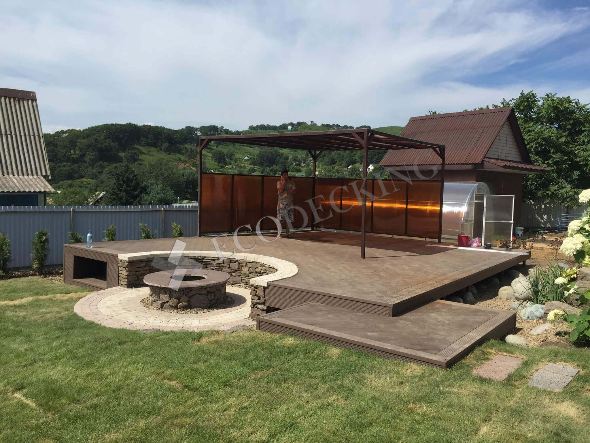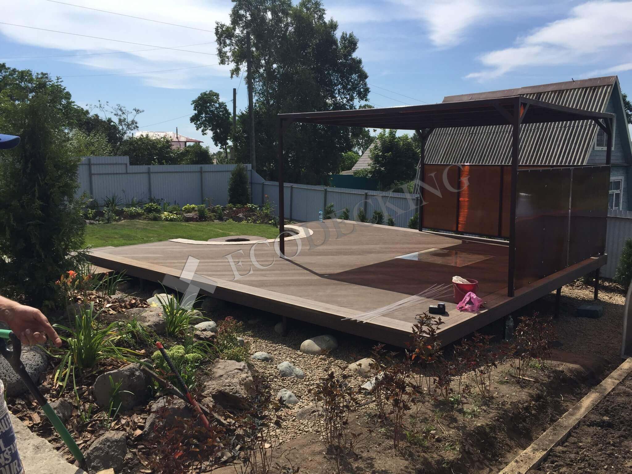 У заказчика был проект террасы с беседкой, который мы воплотили. Площадь объекта около 30 кв.м., предварительно был собран металлокаркас из профильной трубы с учетом предполагаемой нагрузки. Хозяева получили эстетичное напольное покрытие для улицы, которое не требует особого ухода, выдерживает нагрузку, и долго прослужит при правильной эксплуатации. В солнечные дни здесь будет особенно приятно ходить босиком, т.к. террасная доска ДКП теплая и приятная тактильно. В уходе она не привередлива: ее достаточно подметать, можно мыть проточной водой.