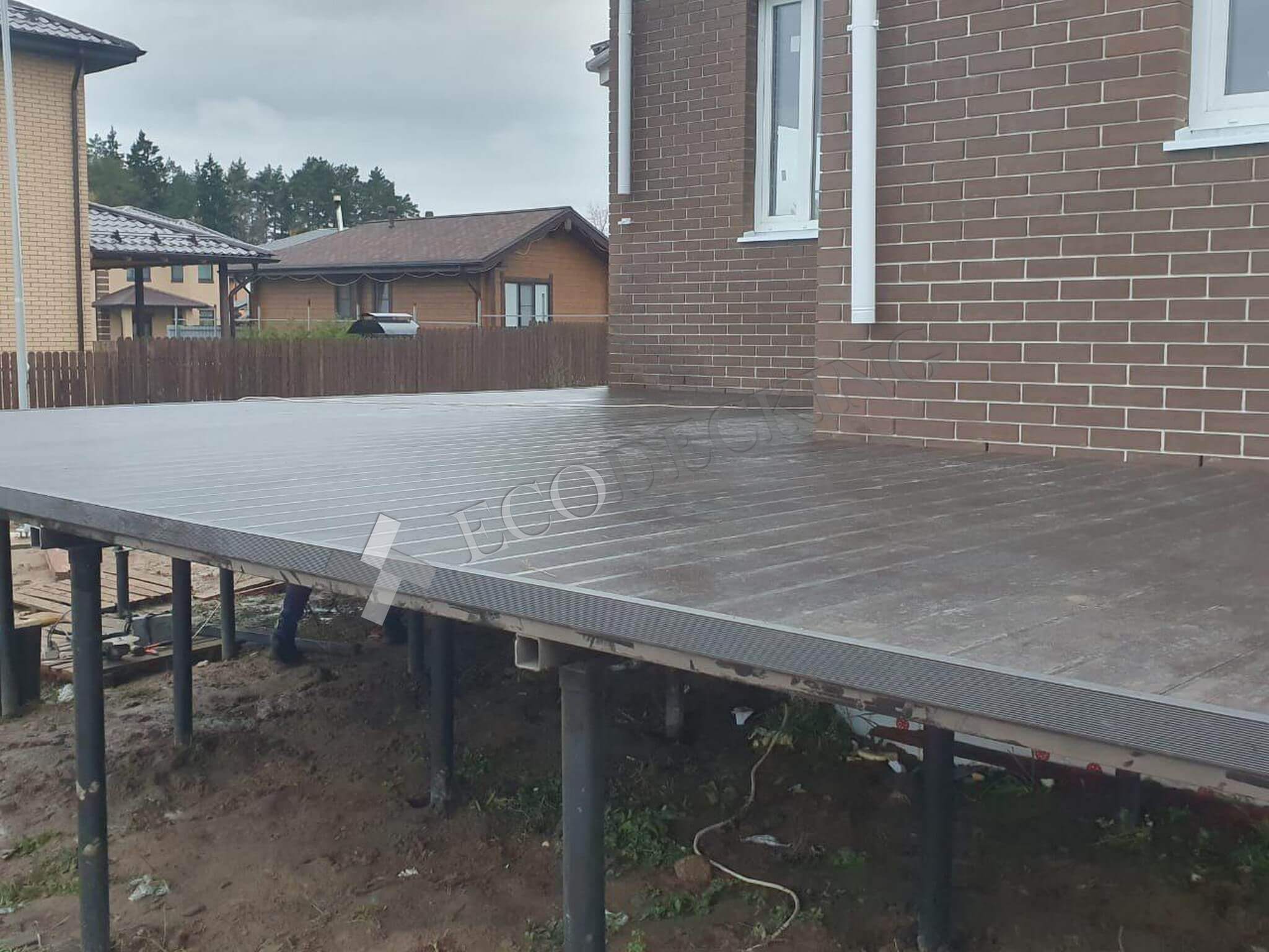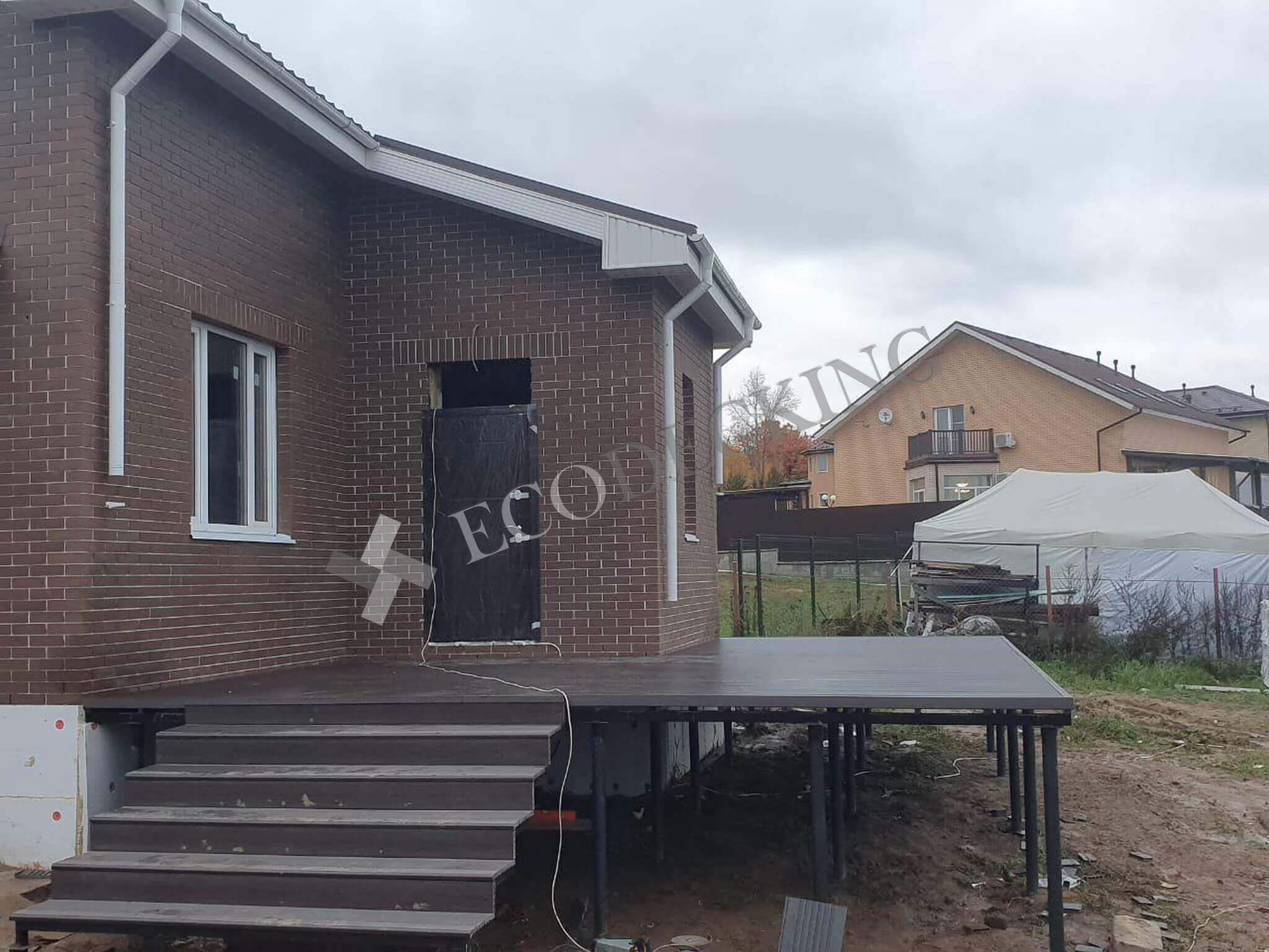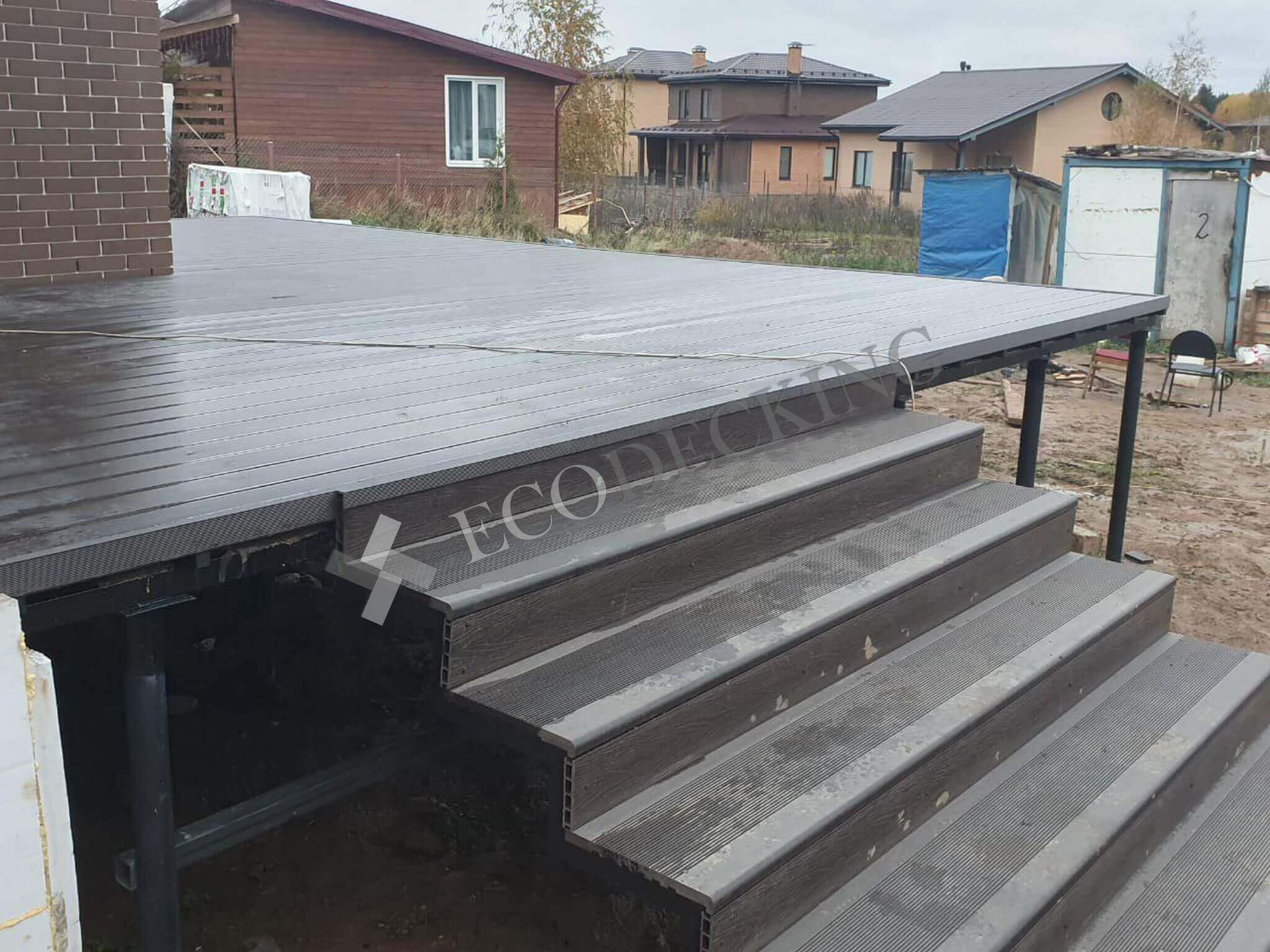 Для клиента необходимо было сделать террасу перед домом и спуск по ступеням с террасы. Ступени Ecodecking идеально подошли для данной задачи. Клиент в дальнейшем будет делать ограждения для удобства спуска.