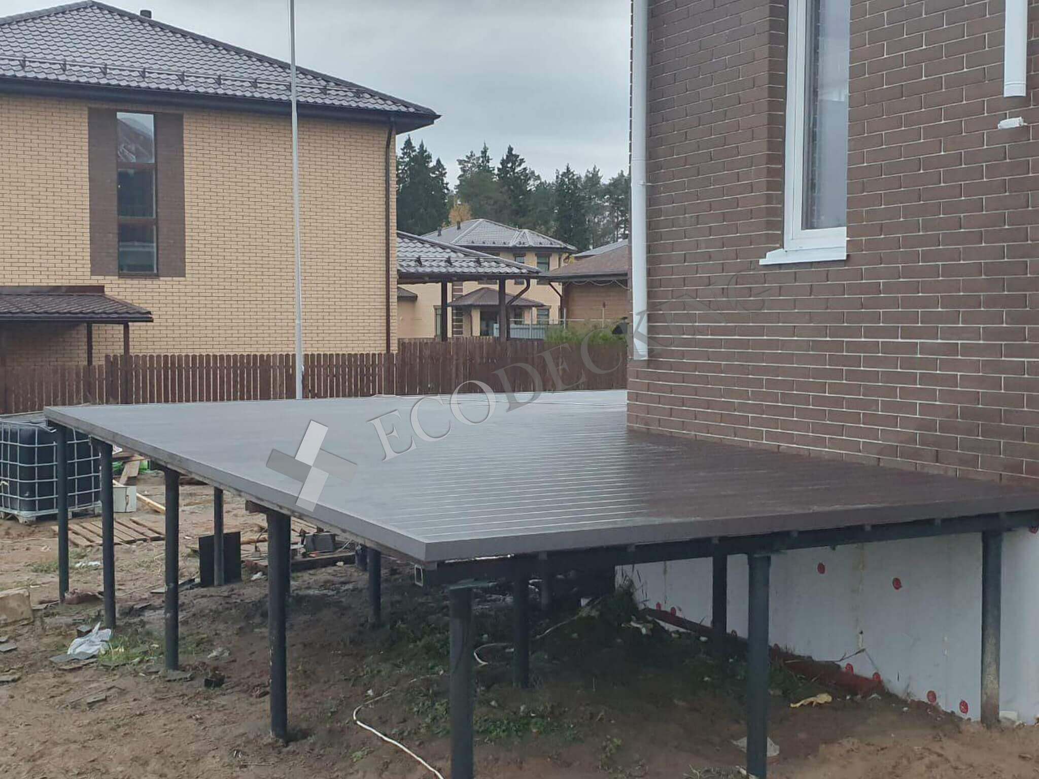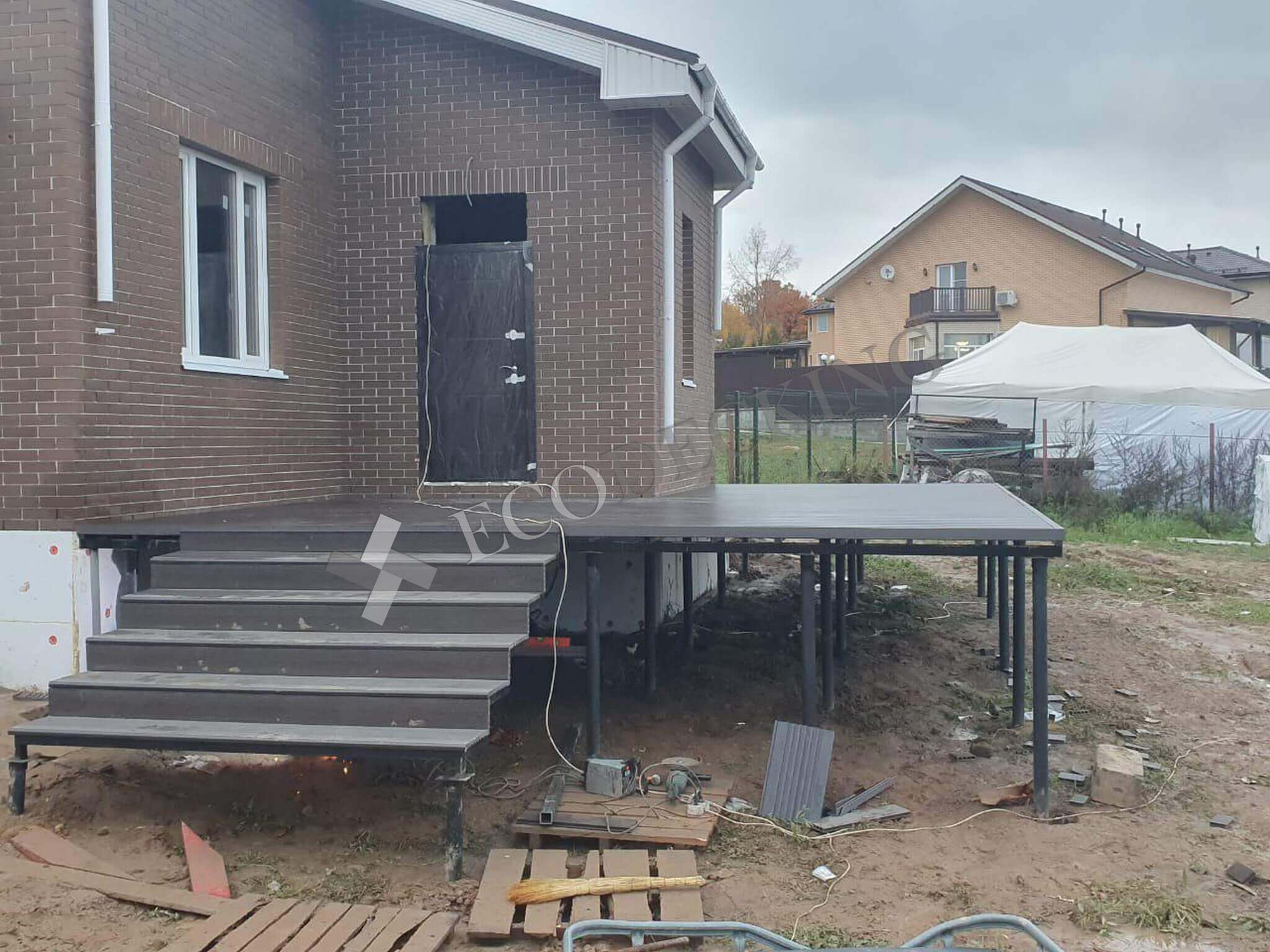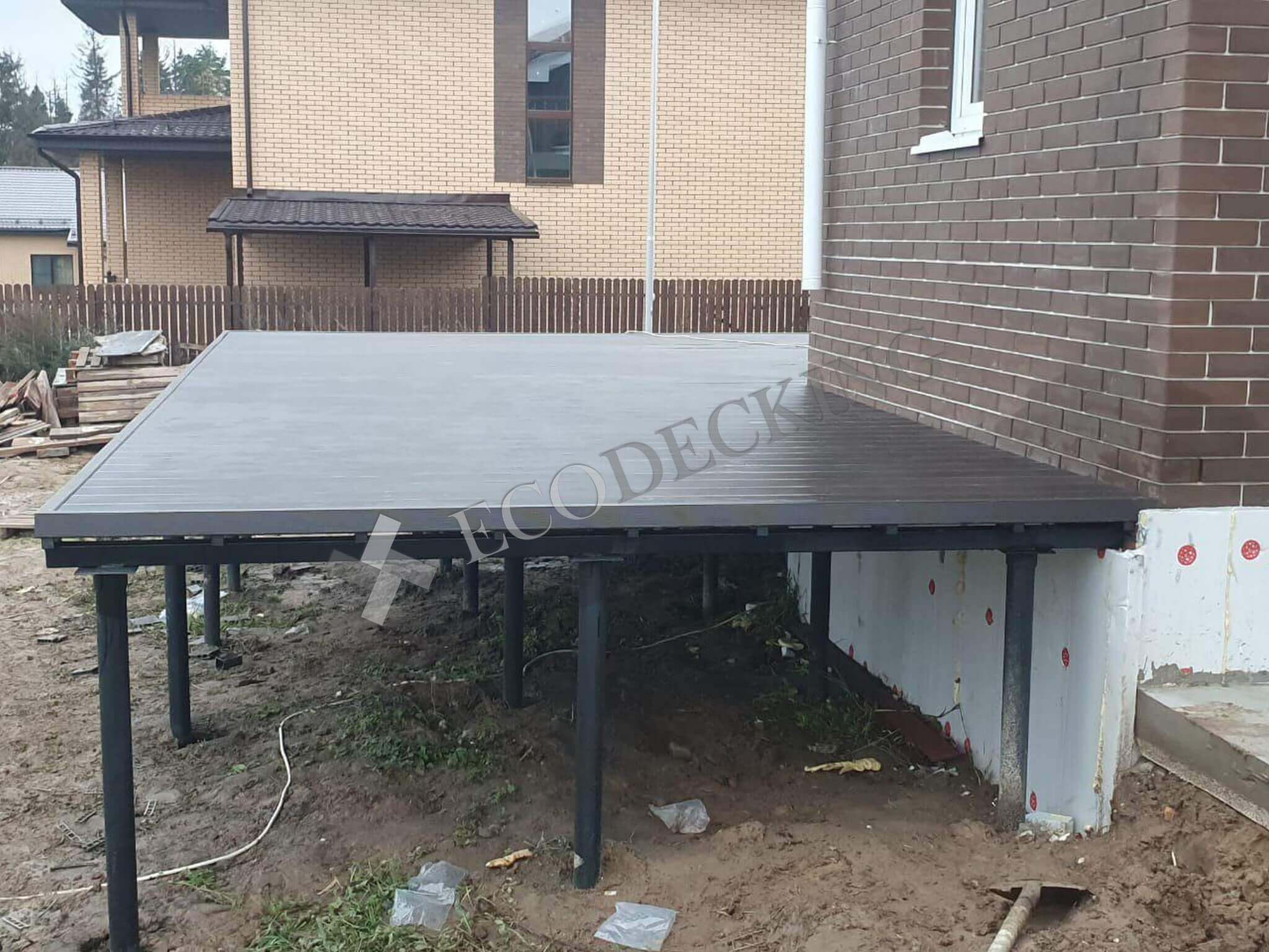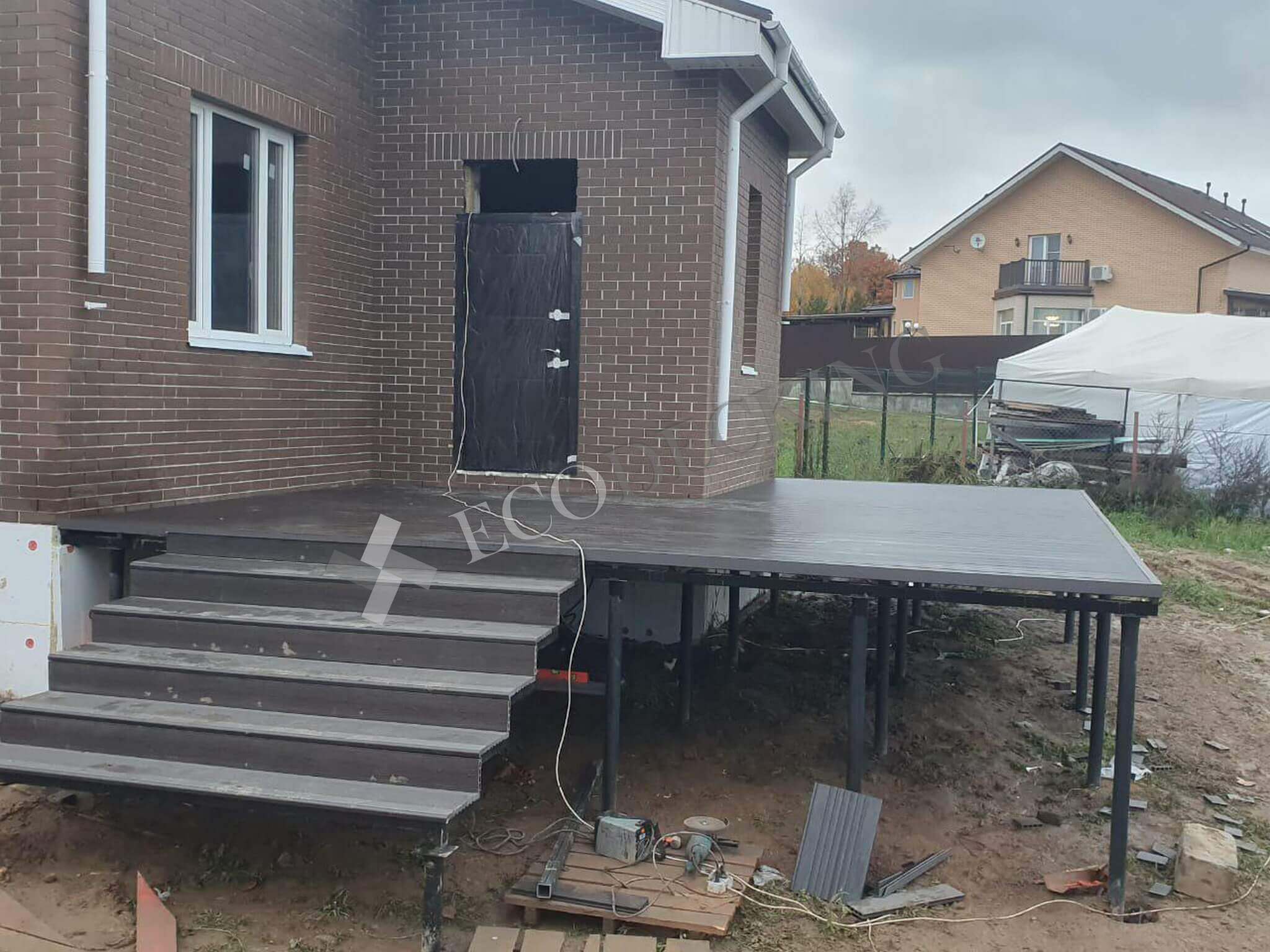 Для клиента необходимо было сделать террасу перед домом и спуск по ступеням с террасы. Ступени Ecodecking идеально подошли для данной задачи. Клиент в дальнейшем будет делать ограждения для удобства спуска.