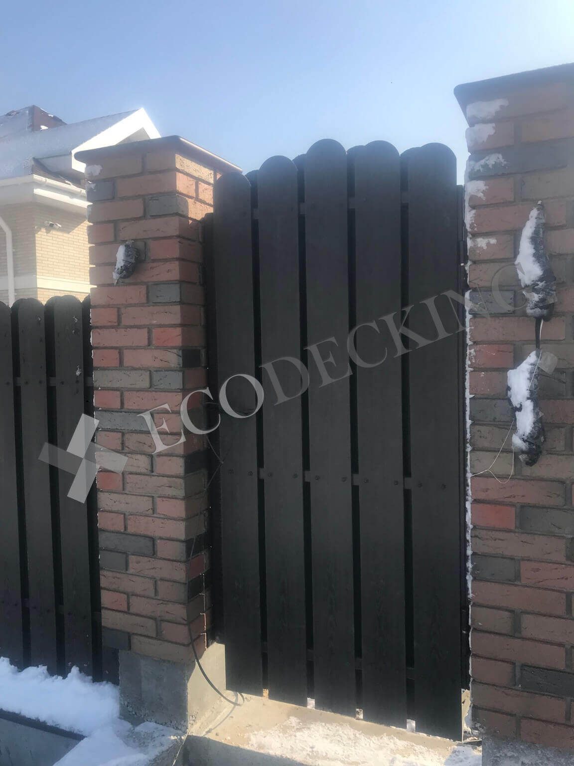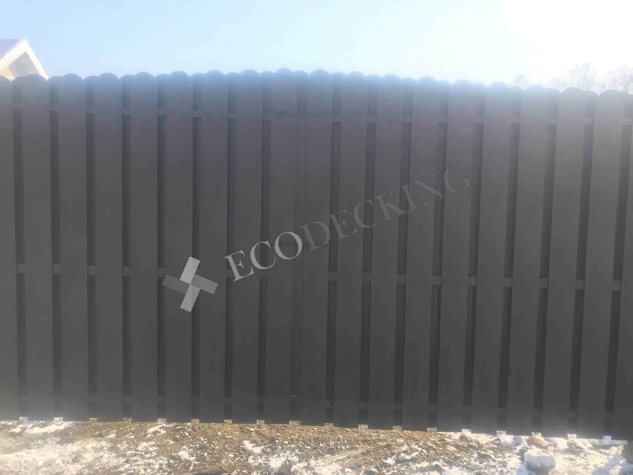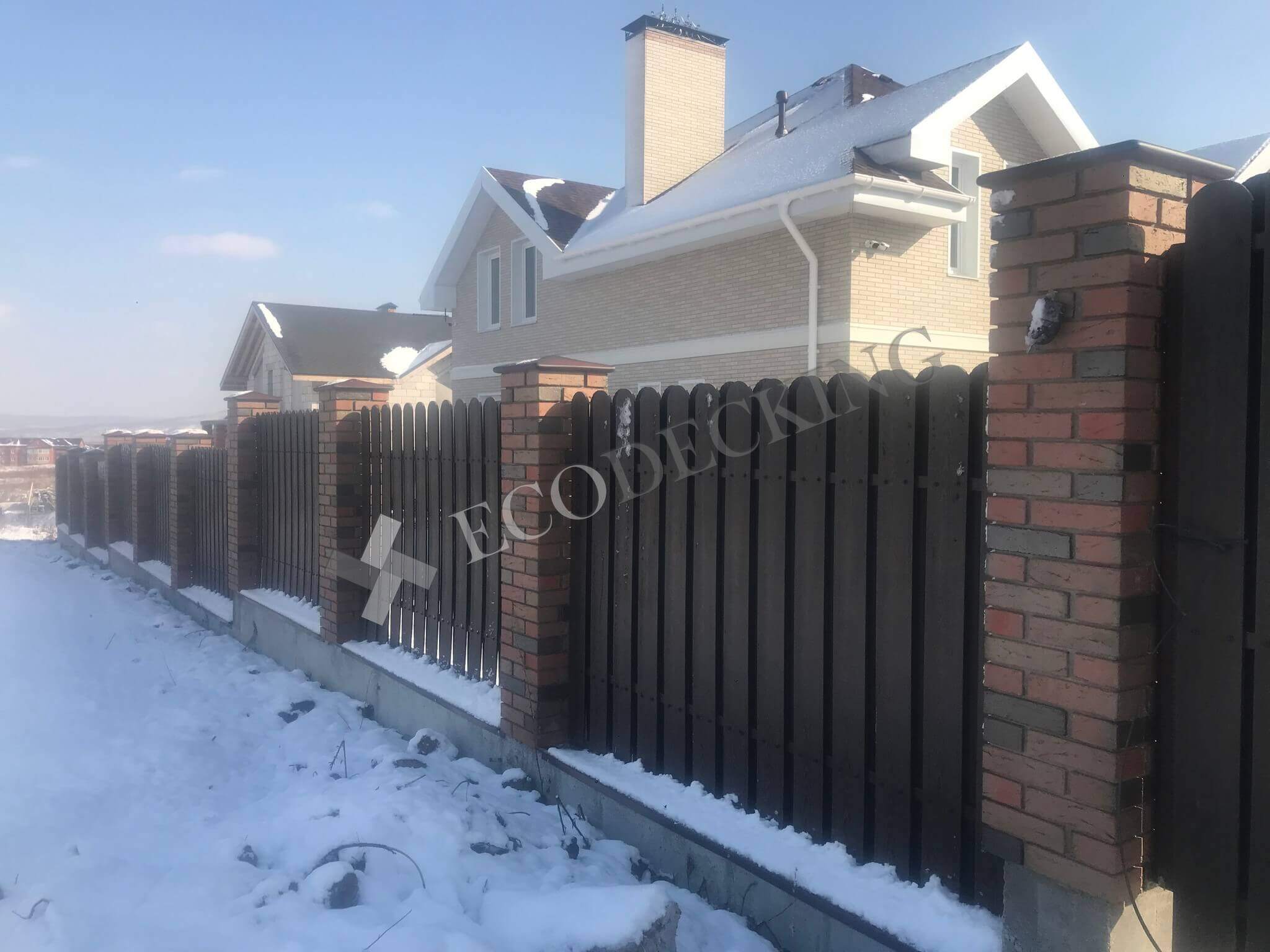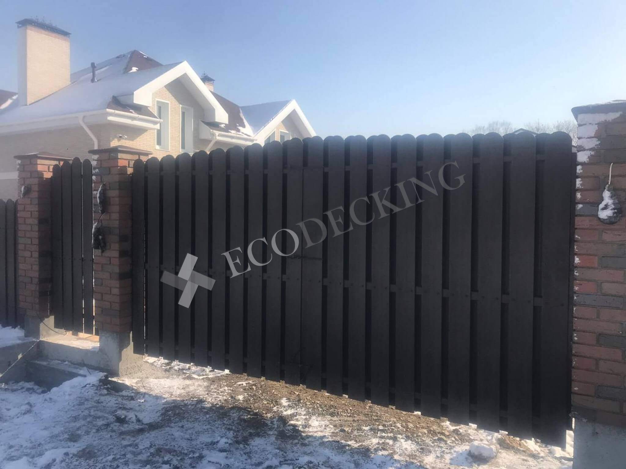 Заборная доска Ecodecking Classic цвет шоколад размер 11х145 выполняли монтаж у клиента в городе Южно Сахалинск на острове Сахалин в самом восточном крае нашей страны. Выполняли закругление доски по просьбе клиента. Было выполнено 2 варианта сборки забора: 1. Сплошной штакетник 2. Штакетник двухрядный. Результатом клиент удовлетворен.