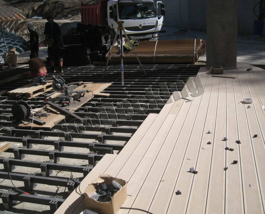 Этот вид каркаса не особо распространен, что связано с достаточной сложностью его воплощения. В таком виде основания в качестве лаг для установки террасной доски применяется подкладочный профиль из ДПК большого сечения (35х60,30х50, 50х50 и т.д.), имеющий по крайней мере 2-3 ребра жесткости. Монтажная лага устанавливается на монтажную отметку, и под нее нарезаются подставки, выполненные из такого же материала. Каждая подставка имеет определенную длину, которая нивелирует степень разуклонки кровли и обеспечивает надежную опору и жесткость конструкции. Общая рекомендация, что такая подпорка устанавливается на каждые 30 см длинны лаги. Подпорка крепиться к лаги саморезами на подвес, либо 3 таких опоры скручиваются вместе.